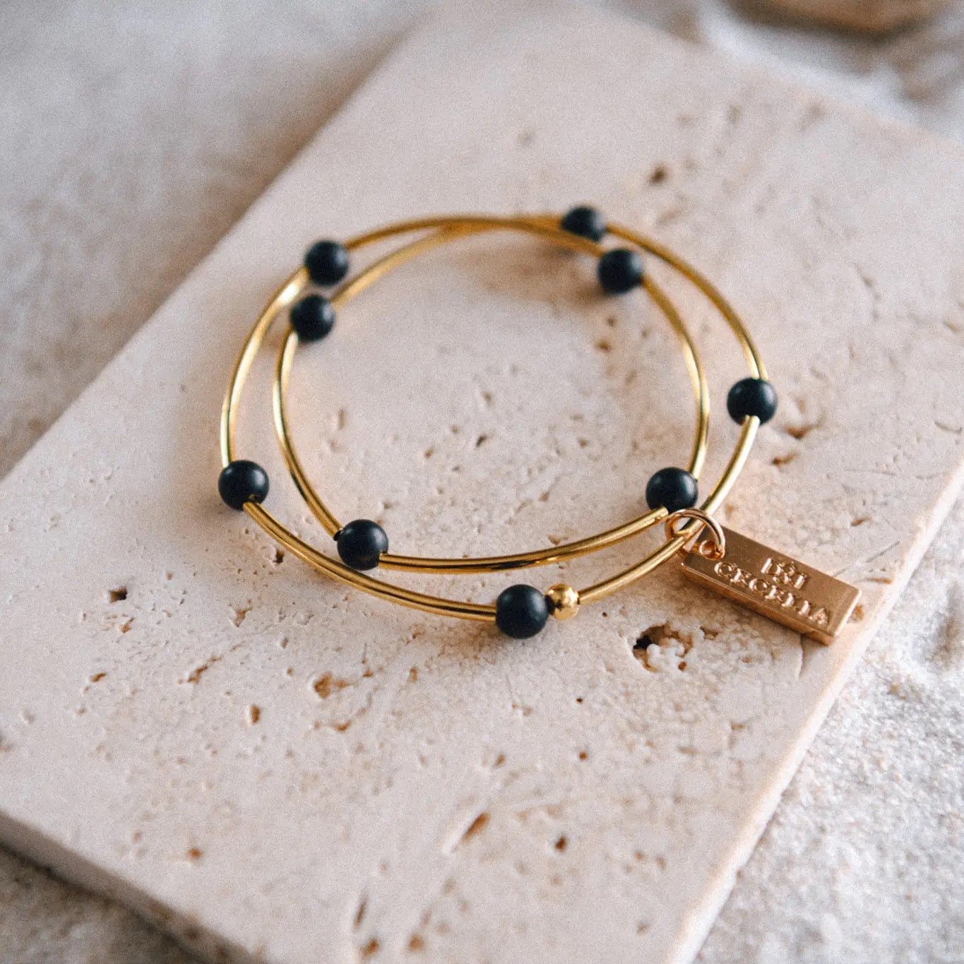 These stretch bracelets includes a dangling, attractive gold-plated bar-tag.