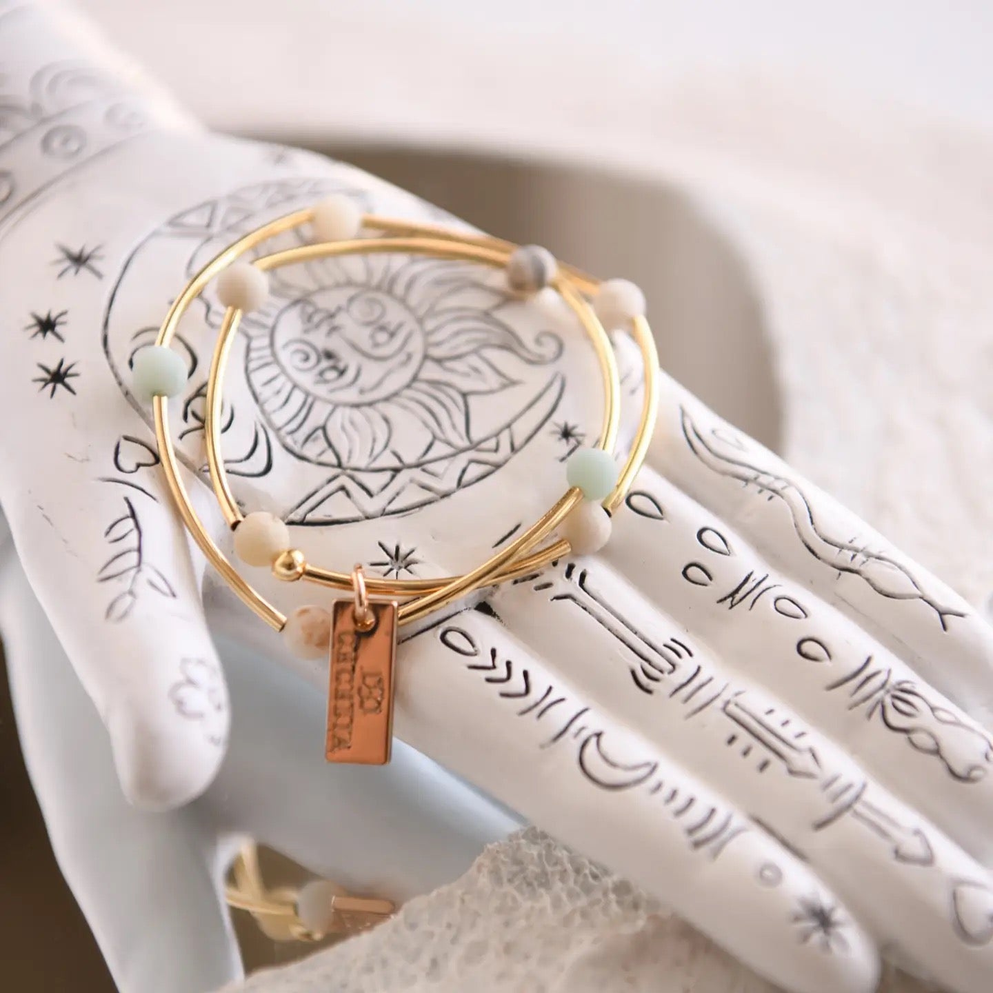 Materials: Gold-Plated spacers; Real stone (Red Jasper, Black Agate, Blue Amazonite, White Amazonite).