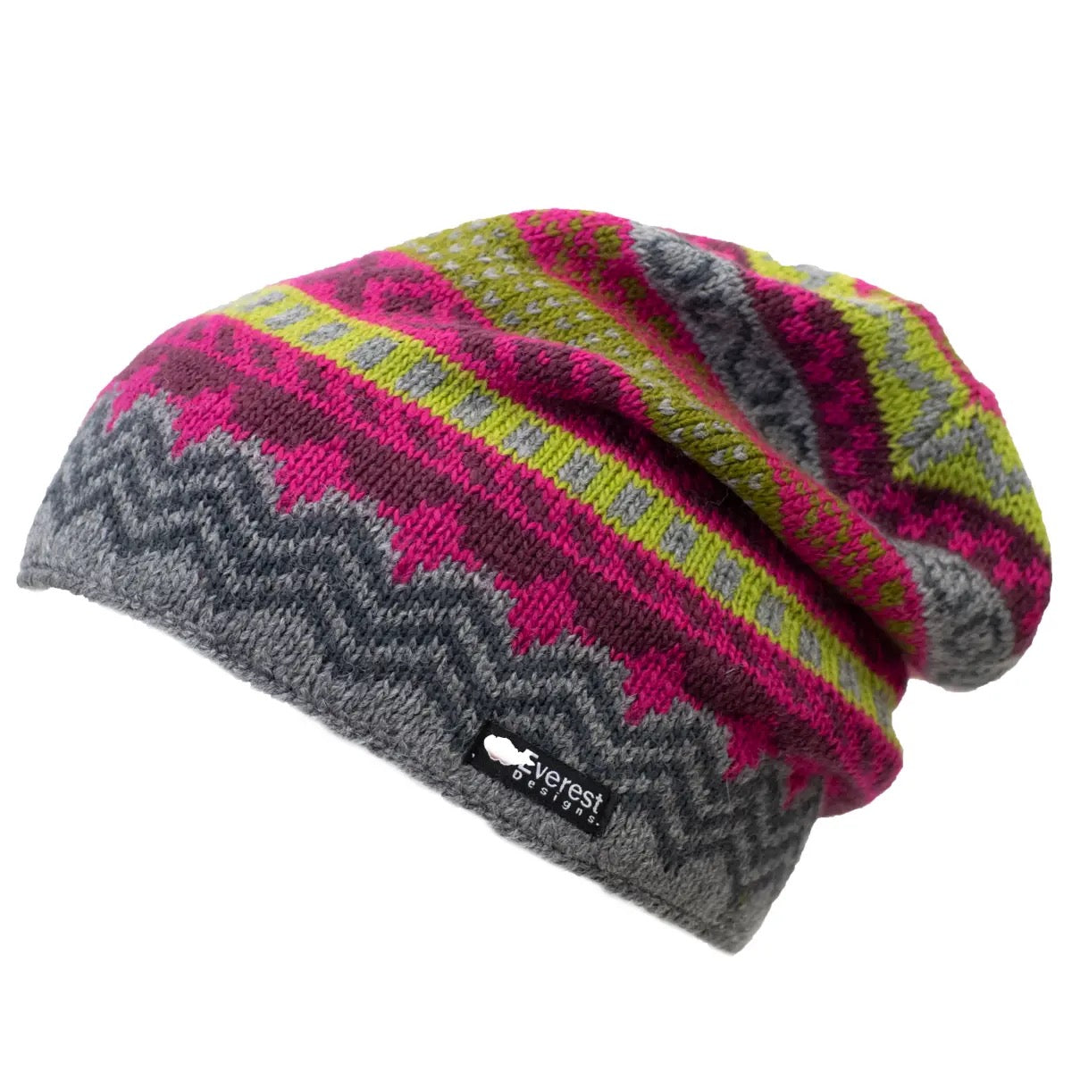 Hand-dyed as well as hand-knitted, this Nepalese beanie gives off street-cred vibes but mountain cache. Made with an extra-thin single strand of yard, making this hat light weight wonder. Half, fleece-lined. Extra long for extra "cool" warmth.
