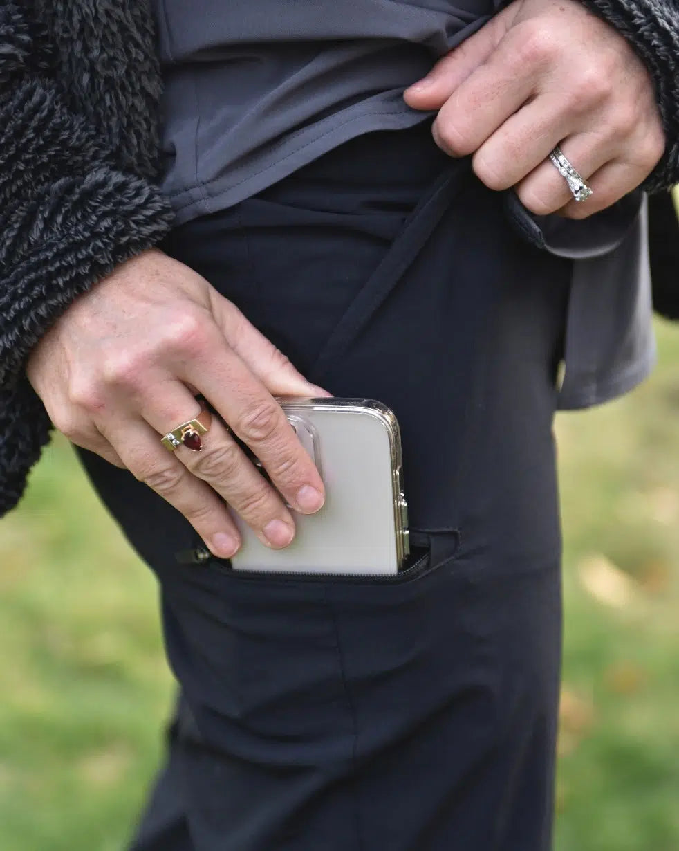 The perfect winter pant for Adirondack life of all kinds: "Smartie Pants". Technical outdoor functionality that has comfort and durability is brought to everyday design. Outside shell is stretchy and durable with water resistant and long-lasting wear built into it. Breathable stretch fleece inside feels like being wrapped in a cozy blanket. Waist adjusters and elastic back for better fit. Discrete side phone pocket for modern convenience. Deep zippered pockets. Looks at home with tall boots or ankle ones. Sizes 4-16.